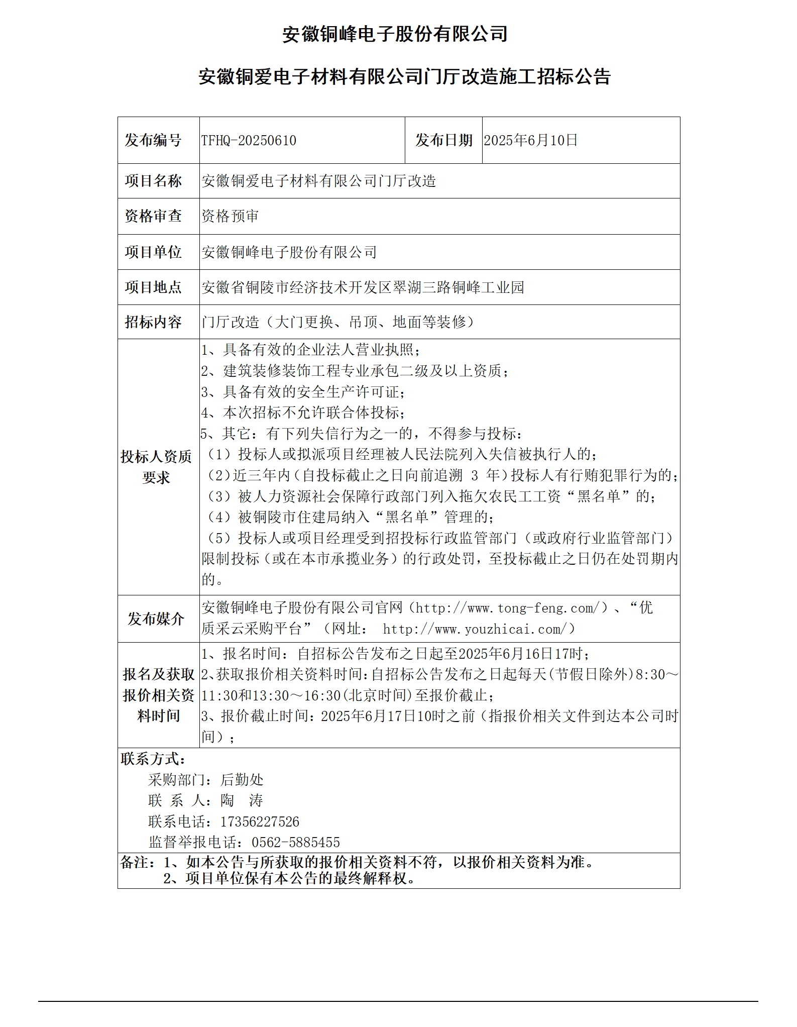 安徽銅峰電子股份有限公司 (銅愛電子公司門廳改造招標公告)_01
