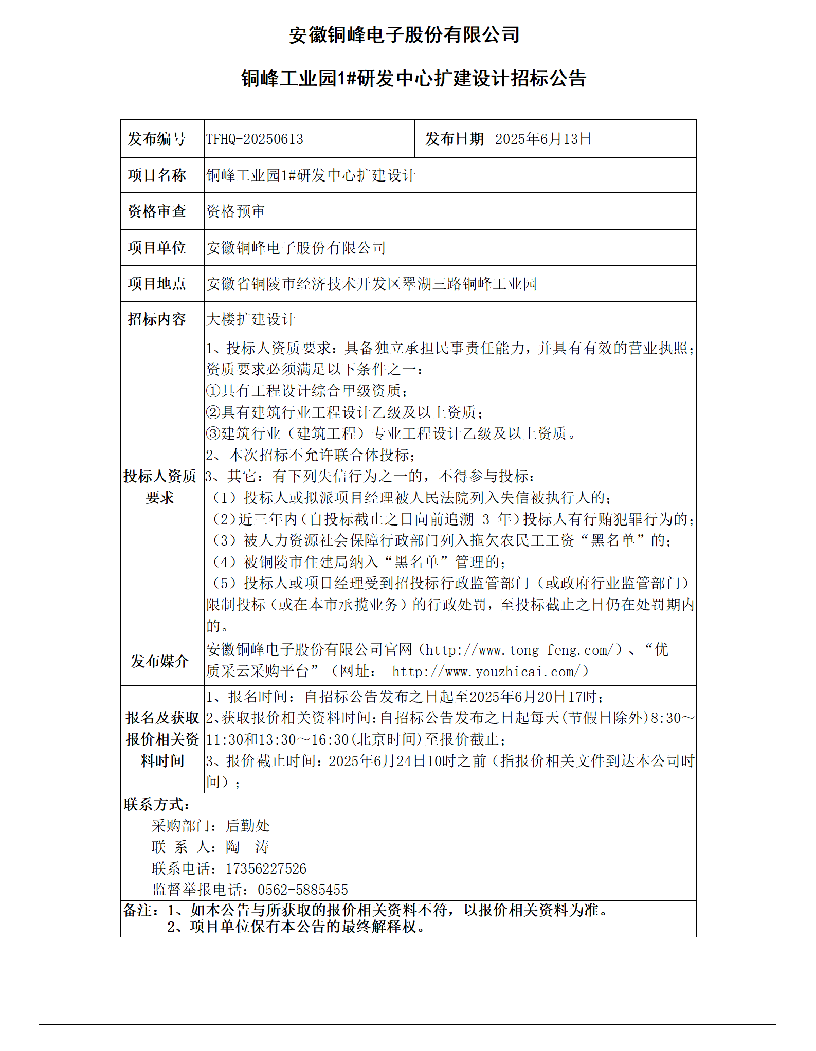安徽銅峰電子股份有限公司 (銅峰工業(yè)園1#研發(fā)中心擴建設計招標公告)_01