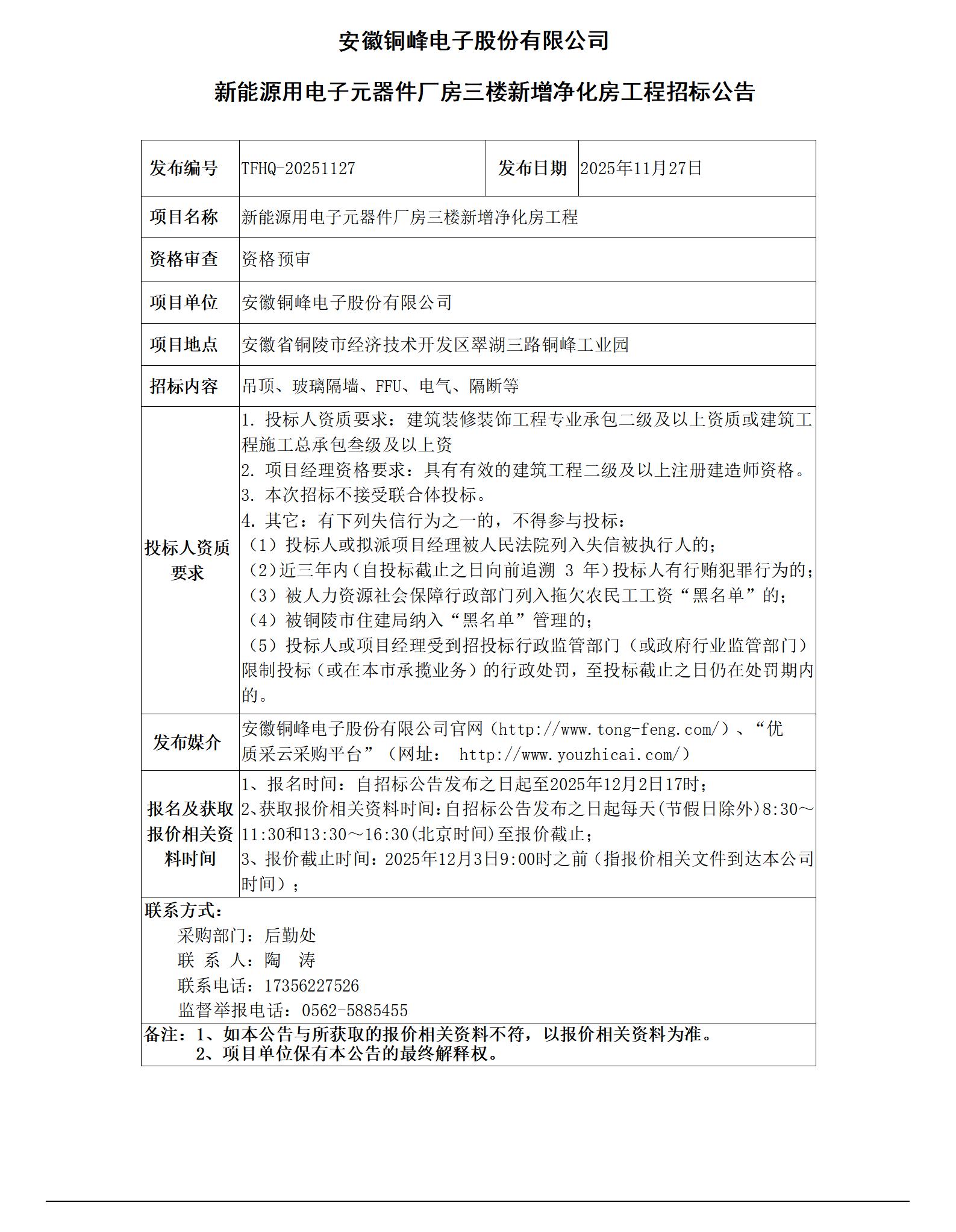 01安徽銅峰電子股份有限公司 (新能源用電子元器件廠房三樓新增凈化房工程 招標(biāo)公告)_01