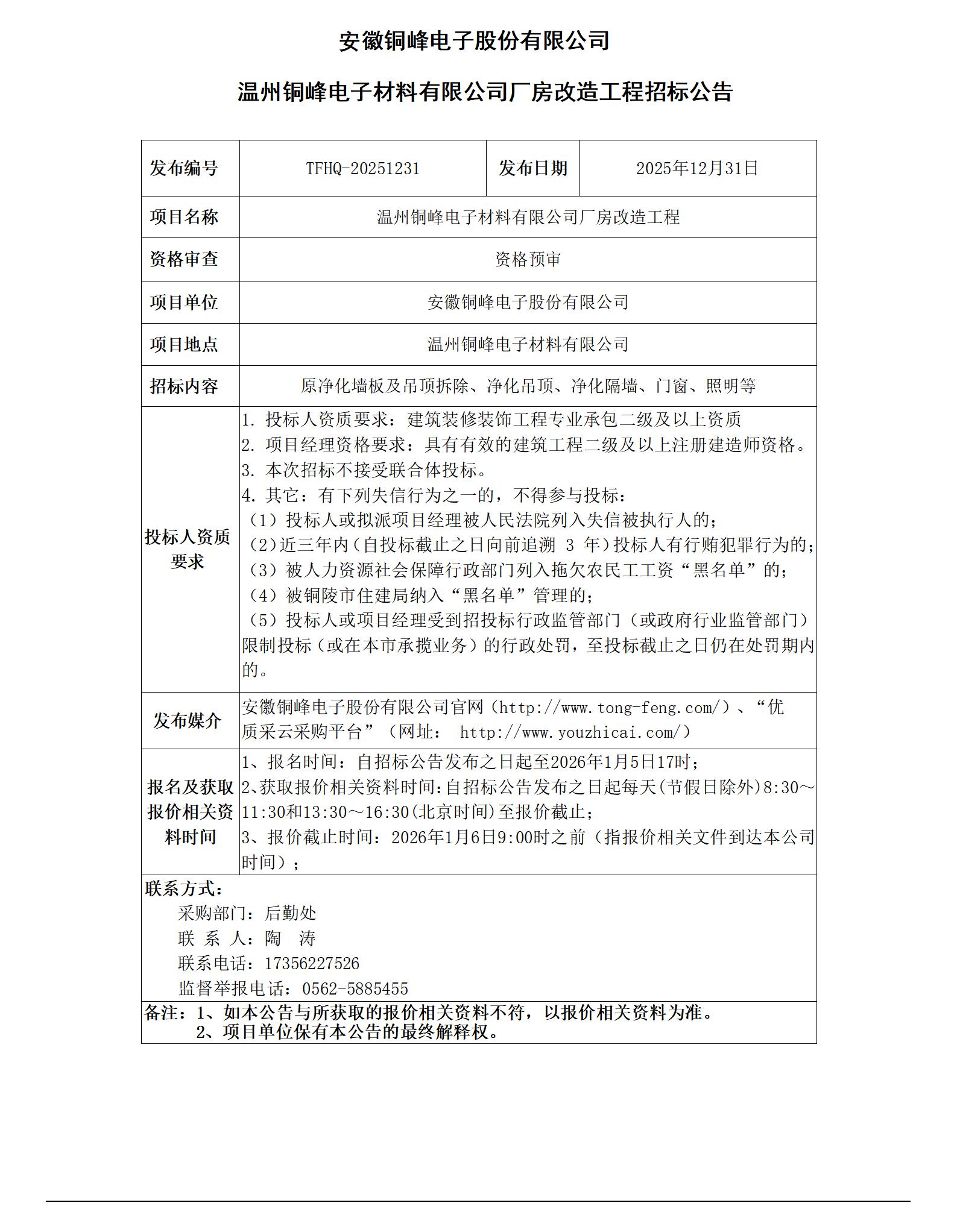 01-安徽銅峰電子股份有限公司 (溫州銅峰電子材料有限公司廠房改造工程 招標公告)_01