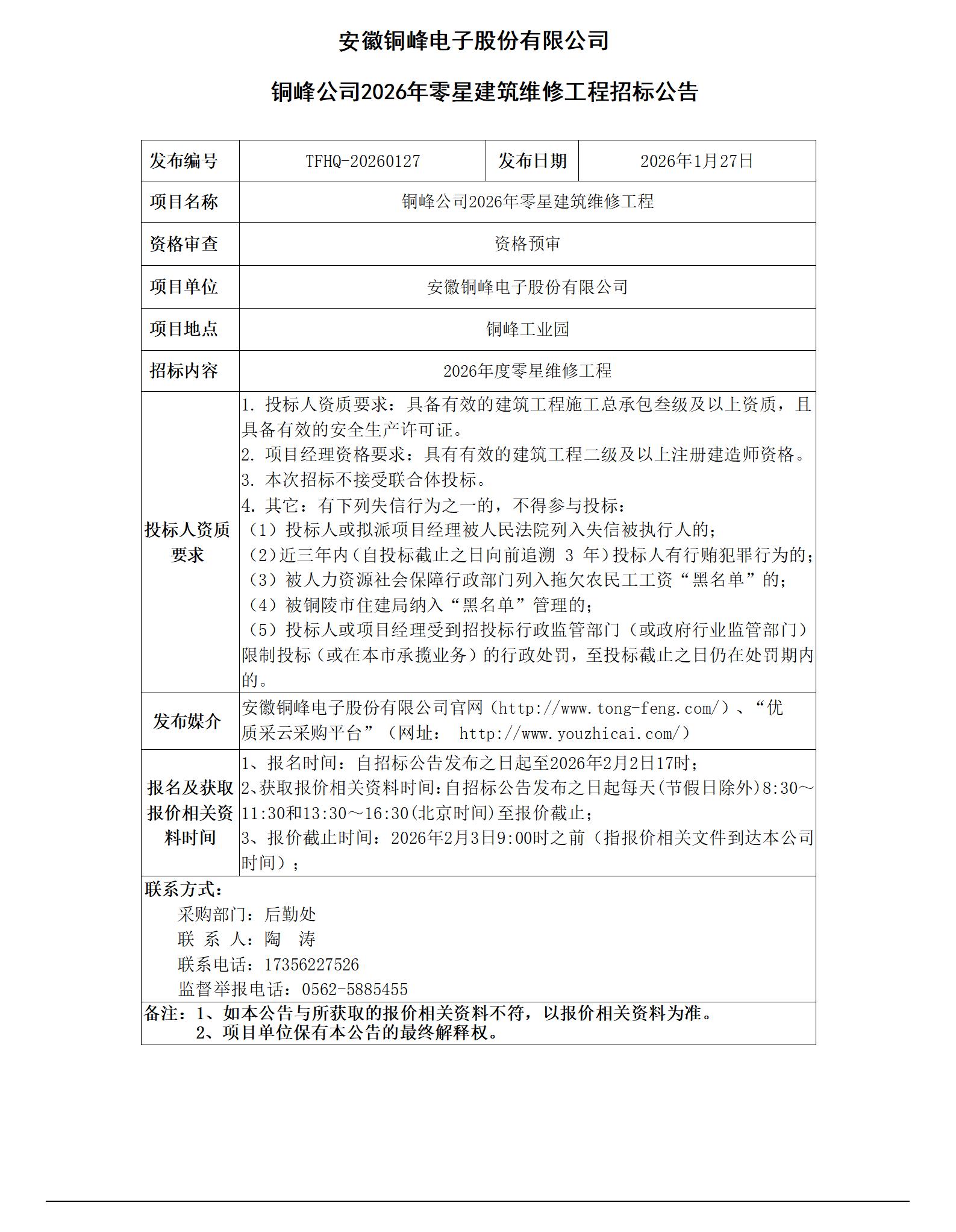 安徽銅峰電子股份有限公司 (銅峰公司2026年零星建筑維修工程 招標公告)_01