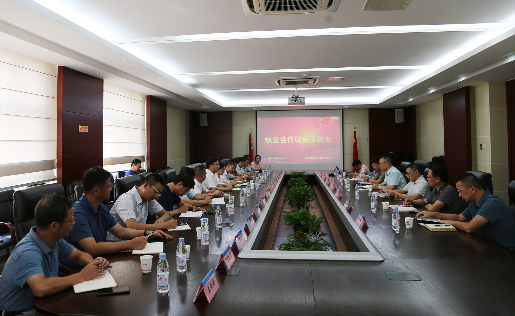 8月24日下午,銅陵職業(yè)技術(shù)學(xué)院黨委書記、市發(fā)改委主任凌勇,黨委副書記、院長(zhǎng)凌濤,黨委副書記徐文等學(xué)院領(lǐng)導(dǎo)和相關(guān)職能處室負(fù)責(zé)人來公司開展校企合作調(diào)研座談活動(dòng)。公司黨委書記、董事長(zhǎng)黃明強(qiáng),常務(wù)副總經(jīng)理、總工程師儲(chǔ)松潮,副總經(jīng)理、財(cái)務(wù)總監(jiān)郭傳紅,黨委副書記、紀(jì)委書記、工會(huì)主席潘世宇及相關(guān)職能部門負(fù)責(zé)人陪同調(diào)研。