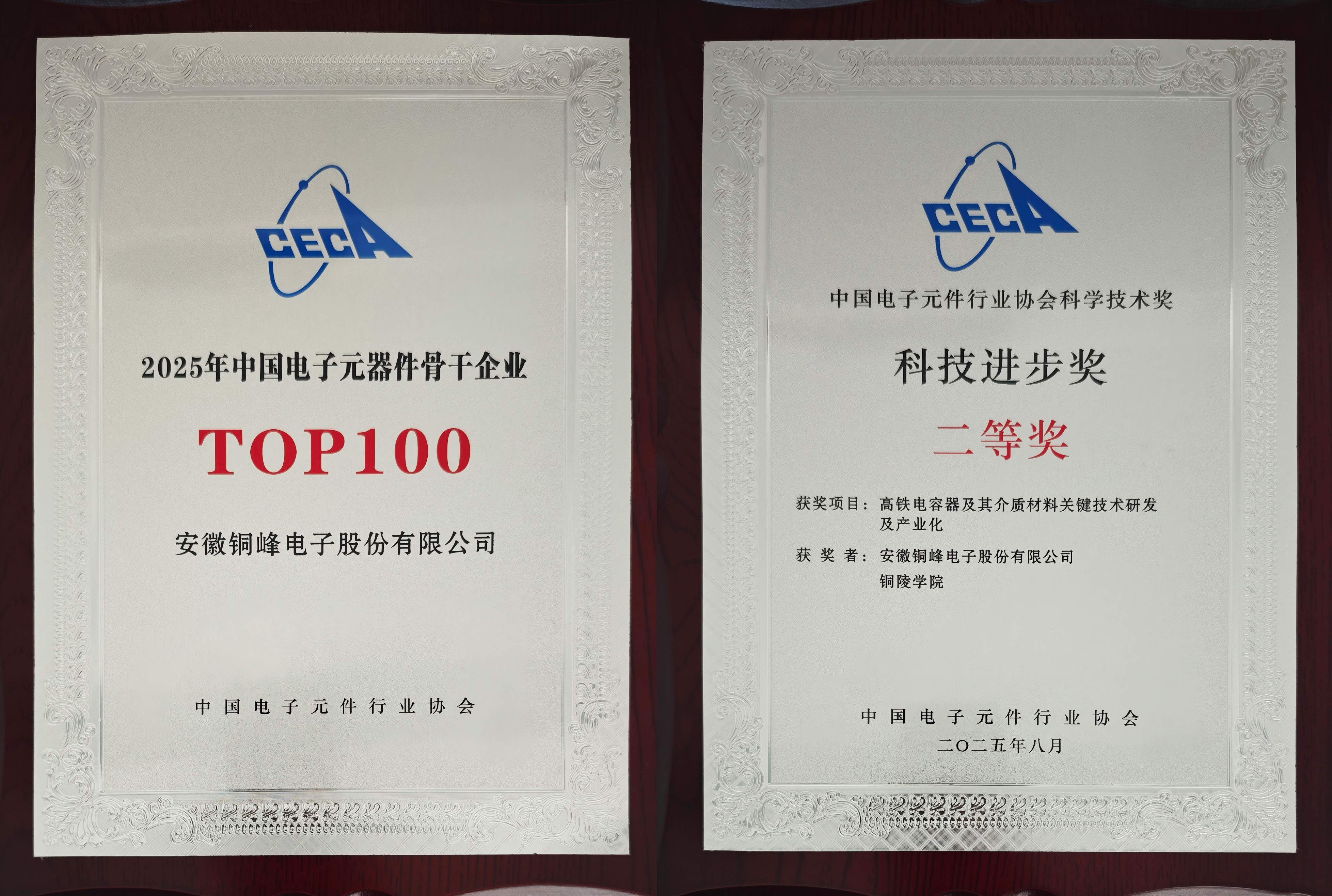 會議過程中,除舉辦主題演講、高端對話、分會平行論壇外,還舉行了2025年中國電子元器件骨干企業(yè)、2025年度(第3屆)中國電子元件行業(yè)協(xié)會科學(xué)技術(shù)獎頒獎儀式,公司連續(xù)三十余屆獲評“中國電子元器件骨干行業(yè)TOP100 ”榮譽,并榮獲中電元協(xié)科技進(jìn)步二等獎。