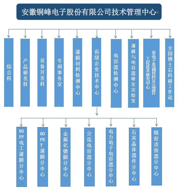 銅峰公司為國家高新技術(shù)企業(yè)、國家火炬計劃重點高新技術(shù)企業(yè)、國家火炬計劃銅陵電子材料產(chǎn)業(yè)基地重點骨干企業(yè)。公司建有完整的科研創(chuàng)新組織體系,設(shè)立技術(shù)管理中心作為技術(shù)研發(fā)的總管理機構(gòu),組織協(xié)調(diào)公司的各分子公司和相關(guān)部門,以確保公司技術(shù)創(chuàng)新精確高效地運行。技術(shù)管理中心下設(shè)綜合科、產(chǎn)品研發(fā)科、設(shè)備開發(fā)科、專利事務(wù)室、薄膜材料檢測中心、電容器檢測中心以及薄膜與電容器研發(fā)實驗室,同時下設(shè)省級企業(yè)技術(shù)中心、安徽省電子基礎(chǔ)材料及元器件工程技術(shù)研究中心以及國家級博士后科研工作站。